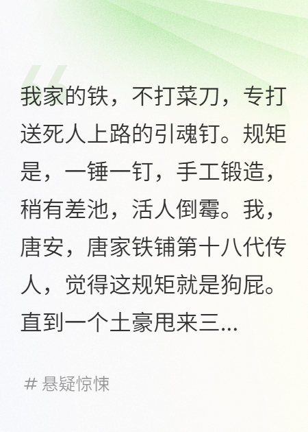 最爱椰子汁-著 查看男女主角分别是【赵大海钉子引魂钉】的悬疑惊悚小说《老祖宗的规矩?那是老古董的裹脚布!》,由新晋小说家“请教我胡言乱语”所著,充满了奇幻色彩和感人瞬间,本站无弹窗干扰,欢迎阅读!本书共计12570字,1章节,更新日期为2025-11-19。该作品目前在本网 【tjlcw.com】上完结。小说详情介绍:老祖宗的规矩?那是老古董的裹脚布!