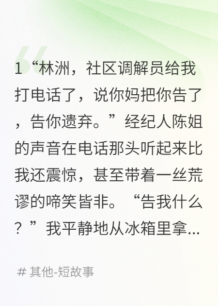 文静De地雷-著 查看男女主角分别是【林海徐然张翠花】的男生生活小说《母亲捐我两百万稿费,转身告我弃养》,由新锐作家“快乐的皮蛋”所著,故事情节跌宕起伏,充满了悬念和惊喜。本站阅读体验极佳,欢迎大家阅读!本书共计20085字,1章节,更新日期为2025-11-19。该作品目前在本网 【tjlcw.com】上完结。小说详情介绍:母亲捐我两百万稿费,转身告我弃养