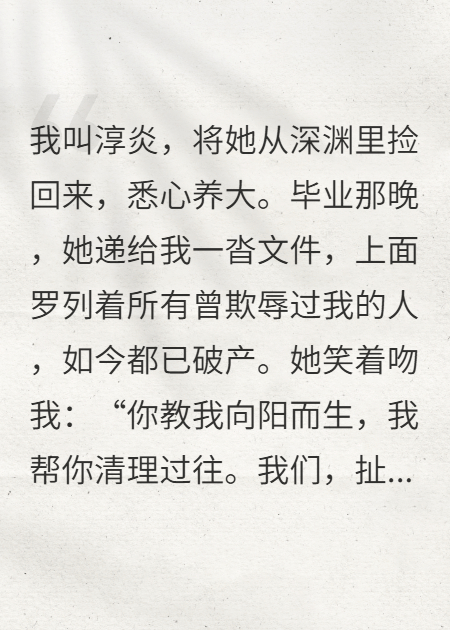 [11-18 14:23] 昨日如死终成灰:林听眠虞从安陈依梦小说特别篇(林听眠虞从安陈依梦)完整章节列表_本站精选 小说《昨日如死终成灰:林听眠虞从安陈依梦小说番外》的主要角色是【林听眠虞从安陈依梦】,这是一本精品短篇小说,由新晋作家“鱼发才”倾力打造,故事情节扣人心弦。本站无广告,欢迎阅读!本书共计25917字,21章节,更新日期为2025-11-18。该作品目前在本网 【tjlcw.com】上完结。小说详情介绍:海城警署界横空出世个刑侦天才,惊破九年前震惊全海城的轮奸致残案,将五名重犯无罪释放。群众皆惊叹海城出了个在世包青天,一举将只有初中学历的陈依梦捧上神坛。却没人知道这背后是陈依梦有恃无恐地制造伪证,彻底过足了把天才瘾。只因她有个局长情人随时给她兜底。可虞从安好像忘了,那五名重犯本是他亲手送进去的。忘了他们是铸成林听眠脸上透骨伤疤,终I身残疾的罪魁祸首。忘了,自己曾红着眼吻过她手腕上一道道刀口,直到林听眠放弃自杀。眼见着那双眼里的爱化作一滩死水。林听眠攥着从警服口袋里拽出的蕾丝内裤,眼泪一滴、一滴砸散在旧红盆里的肥皂水里。