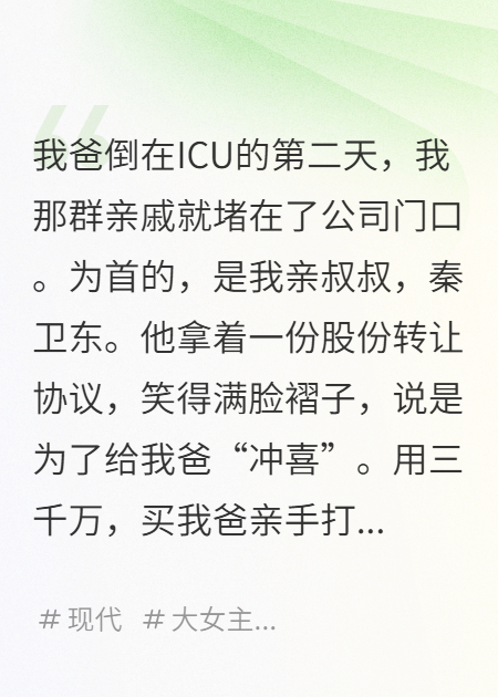 主要角色是【秦卫东赵启明陈舟】的现代,大女主,豪门总裁,爽文,逆袭小说《白纸黑字的合同拍在桌上,他们说这是给我爸冲喜》,由网络红人“雪上加霜的刘则”创作,故事精彩纷呈,本站纯净无广告,欢迎阅读!本书共计14977字,1章节,更新日期为2025-11-18。该作品目前在本网 【tjlcw.com】上完结。小说详情介绍:白纸黑字的合同拍在桌上,他们说这是给我爸冲喜
