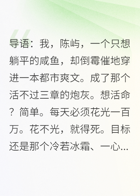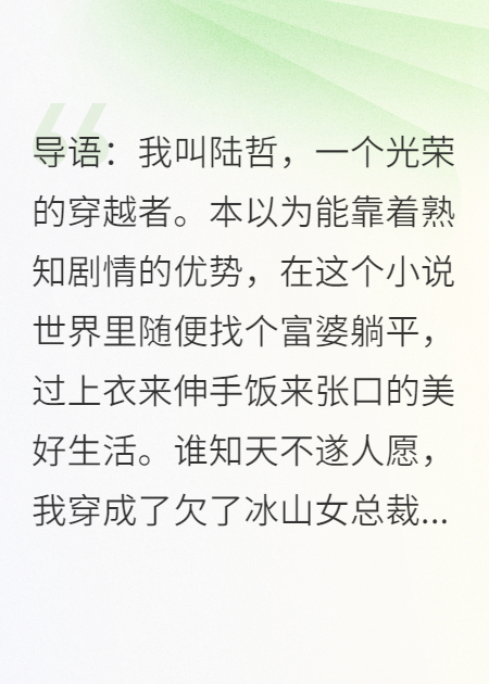 艺童澄长-著 查看情节人物是【江安然】的现代,豪门总裁,爽文,逆袭小说《穿进霸总文只想躺平,却被冰山女总裁逼着当首富》,由网络作家“婼雨”所著,情节扣人心弦,本站TXT全本,欢迎阅读!本书共计13159字,1章节,更新日期为2025-11-18。该作品目前在本网 【tjlcw.com】上完结。小说详情介绍:穿进霸总文只想躺平,却被冰山女总裁逼着当首富