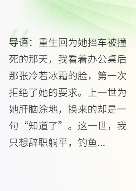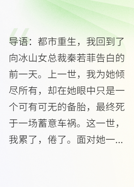 用户42569449-著 查看小说《重生后,我放弃攻略冰山女总裁》的主角是【秦若菲赵恒张总】,这是一本现代,豪门总裁,爽文,逆袭,追妻小说,由才华横溢的“用户42569449”创作,故事情节生动有趣。本站无广告,欢迎阅读!本书共计8244字,1章节,更新日期为2025-11-18。该作品目前在本网 【tjlcw.com】上完结。小说详情介绍:重生后,我放弃攻略冰山女总裁