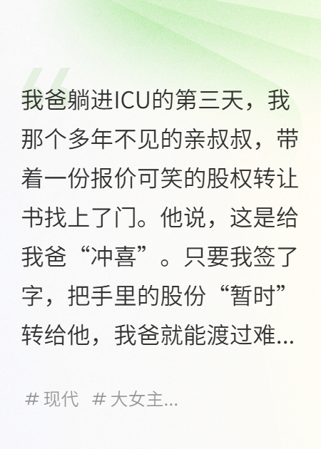 疲倦的绵羊-著 查看男女主角分别是【会议天启科张董】的现代,大女主,豪门总裁,爽文,逆袭全文《他说签了这份冲喜合同,我爸的病就能好》小说,由实力作家“加勒比海怪”所著,讲述一系列精彩纷呈的故事。本站纯净无弹窗,精彩内容欢迎阅读!本书共计15001字,1章节,更新日期为2025-11-18。该作品目前在本网 【tjlcw.com】上完结。小说详情介绍:他说签了这份冲喜合同,我爸的病就能好